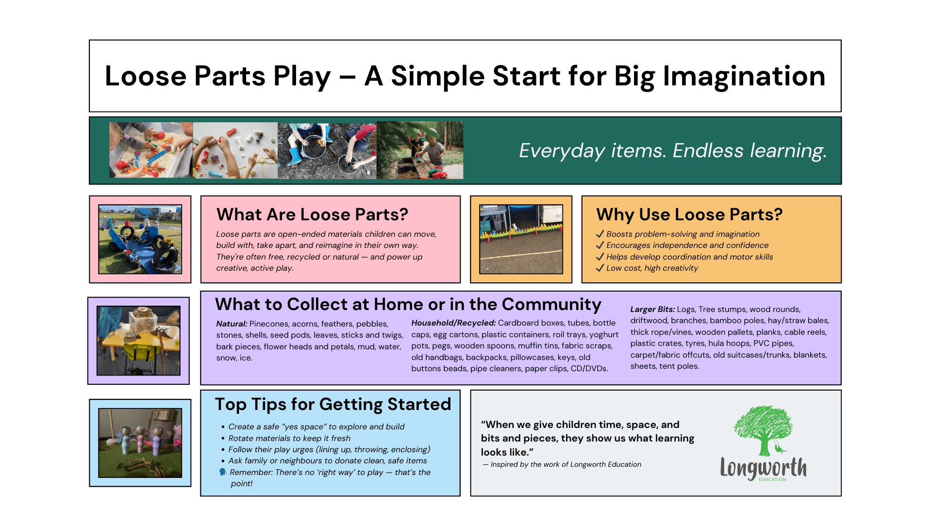 Supporting children’s learning doesn’t have to mean worksheets or expensive toys. In fact, some of the richest learning happens when children are free to explore, create, and follow their own play urges — with the everyday materials we often overlook. This page offers practical, low-cost ideas to help families and communities make space for meaningful play at home and in shared spaces. Download our free resource below to get started.